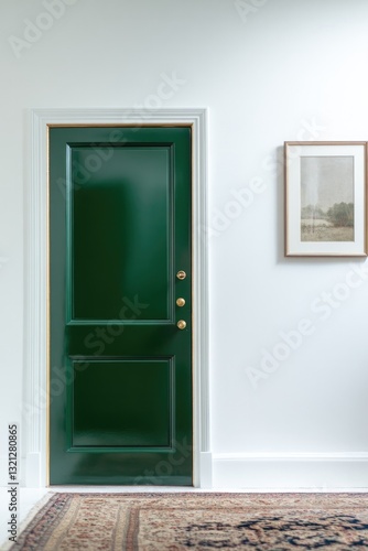 © Nikolai, Fototapeta premium Elegant green door stands out against minimalist white walls, en