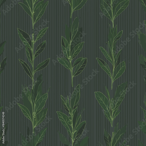 © sabrex, Naklejka premium Elegant Green Leaf Pattern on Striped Background Wallpaper.