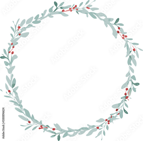Fototapeta premium Elegant Greenery Wreath, Circular Frame, Watercolor Leaves, Red Berries, Festive Design, Botanical I