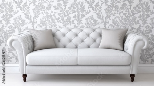© Patchayanit , Fototapeta premium Elegant Grey Damask Patterned Couch with Two Pillows in a Stylish Interior Setting