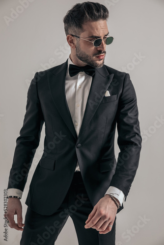 © Viorel Sima, Fototapeta premium elegant groom with sunglasses in black tuxedo looking to side