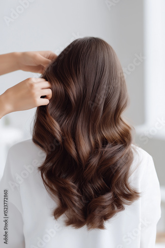Obraz premium Elegant hair styling in a bright salon setting during the daytime with a focus on healthy, wavy hair texture