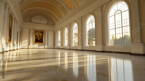 © twc, Fototapeta premium Elegant hall bathed in sunlight, showcasing paintings and expansive windows, reflecting on a polished floor.