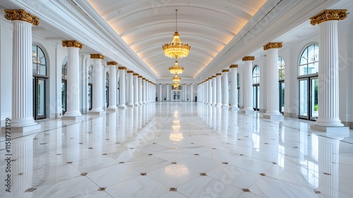© Flavonoids , Obraz premium Elegant Hallway with Marble Flooring and Decorative Chandeliers
