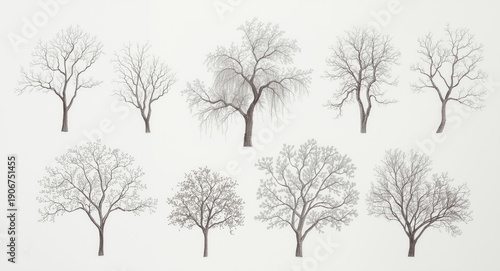 © AkuAku, Fototapeta premium Elegant hand drawn trees organized on a crisp white backdrop