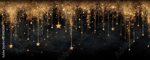 © Georgii, Obraz premium Elegant hanging gold stars and glitter on a dark background
