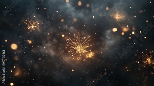 © phianguma, Fototapeta premium Elegant Happy New Year message on a dark, moody abstract backdrop with subtle bursts of gold and silver fireworks in the background.