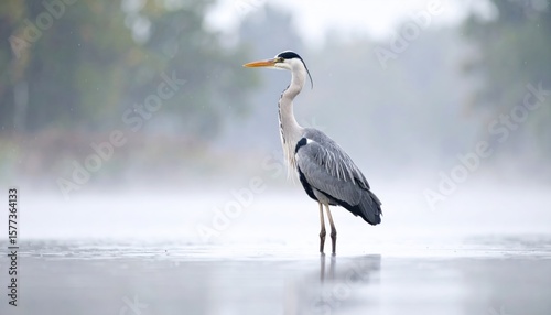 Fototapeta premium Elegant heron wading in tranquil misty waters, showcasing nature's quiet beauty