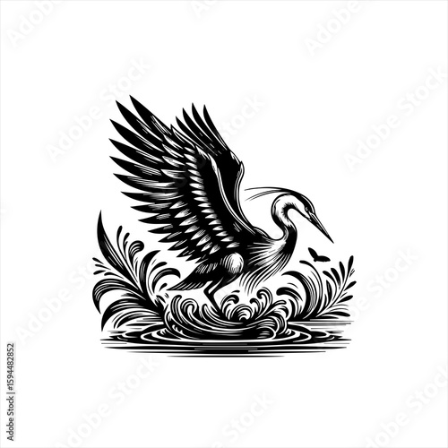 © Rezaul, Fototapeta premium Elegant Heron with Wings Spread in Water.