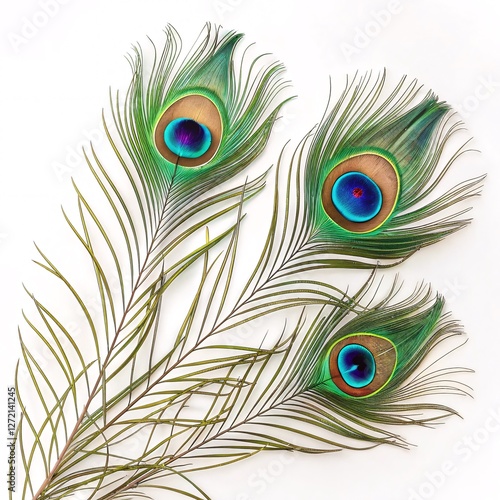 © Nepan, Fototapeta premium Elegant Hindu Invitation Featuring Peacock Feathers on a Pristine White Background for a Sacred and Graceful Celebration Design