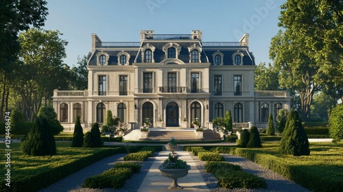 © Tuachan, Obraz premium Elegant Historic Mansion Surrounded by Lush Greenery and Gardens