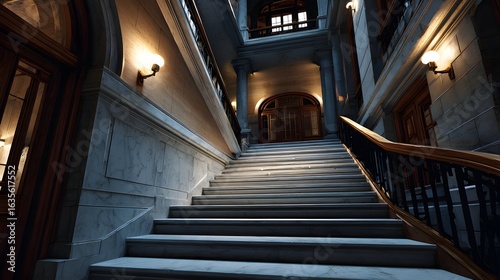 © BEN, Obraz premium Elegant Historic Marble Staircase with Dramatic Lighting and Intricate Architectural Details
