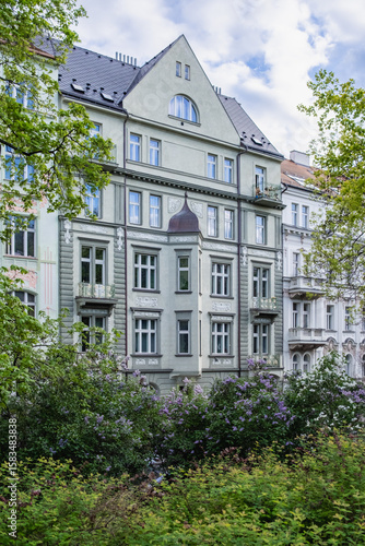 © Olga Mazo, Fototapeta premium Elegant historic residential building in Prague, Czech Republic, framed by blooming lilac bushes and spring greenery, showcasing beautiful European architecture and ornate window details.