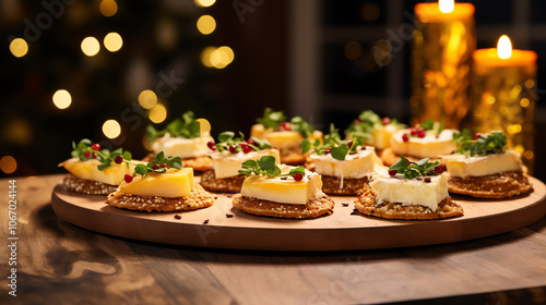 Naklejka premium Elegant holiday canapés on serving platter with bokeh lights