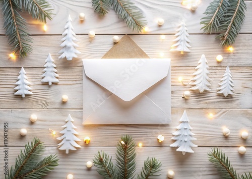© Manatsavee, Fototapeta premium Elegant Holiday Card Mockup with Envelope and Fir Trees on White Wooden Background - Christmas Greeting Card Decoration Flat Lay for Festive Celebrations
