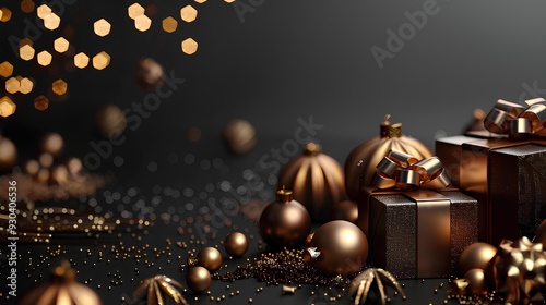 © penpirab, Fototapeta premium Elegant holiday composition with chic bronze gift boxes and baubles on black background. Festive Christmas concept. Luxury design for greeting cards, invitations, or posters.
