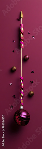Fototapeta premium Elegant holiday ornament with colorful ribbons on a deep burgundy background.
