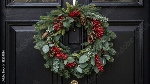 Fototapeta premium Elegant holiday wreath welcomes guests on dark door