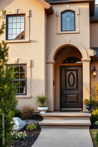 Fototapeta premium Elegant Home Exterior with Modern Architecture and Landscaping. Luxury Real Estate Property with a Stunning Entrance and Pathway