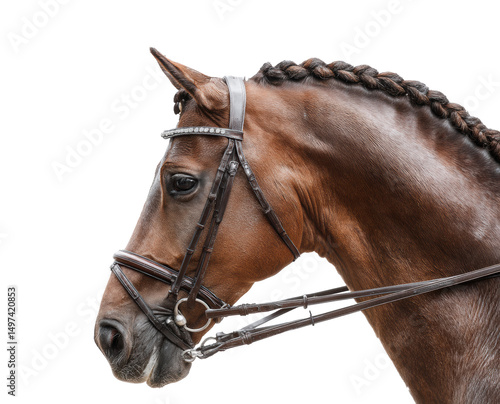 Fototapeta premium Elegant horse head with braided mane for design, cut out transparent