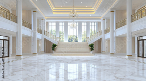 Obraz premium Elegant hotel lobby with grand staircase, marble floor, and chandeliers