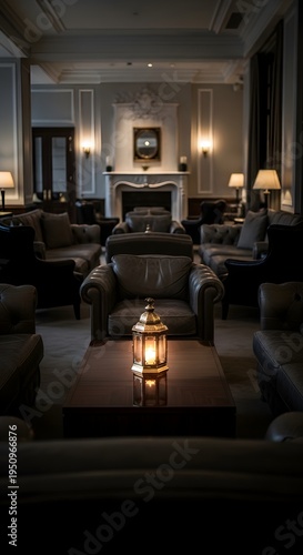 Obraz premium Elegant hotel lounge interior with cozy leather armchairs and warm lantern...
