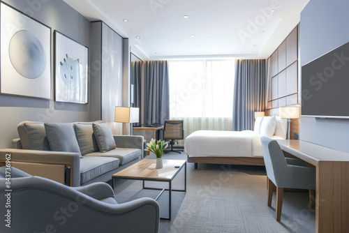Fototapeta premium Elegant hotel room interiors with modern furniture. Hotel interior design...