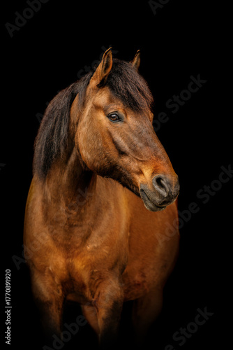 © Annabell Gsödl, Obraz premium Elegant Hucul horse with dark bay coat and thick mane standing against a black background