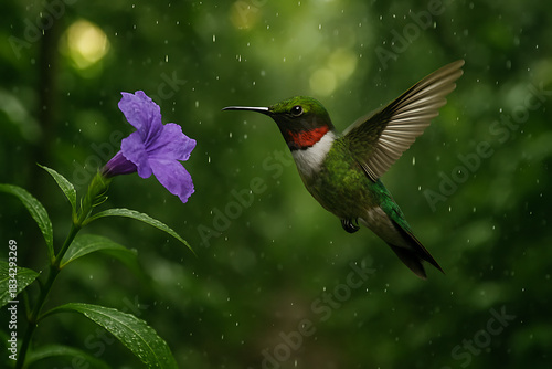 © Jeannette, Fototapeta premium Elegant hummingbird gracefully reaching for vibrant purple flower in gentle rain, a moment of natural wonder and delicate beauty in lush greenery