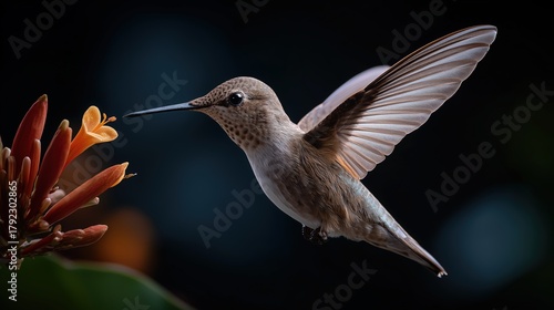 Obraz premium Elegant hummingbird in mid-flight capturing vibrant colors, delicate wings, and natural beauty in a dynamic wildlife scene perfect for nature and outdoor photography