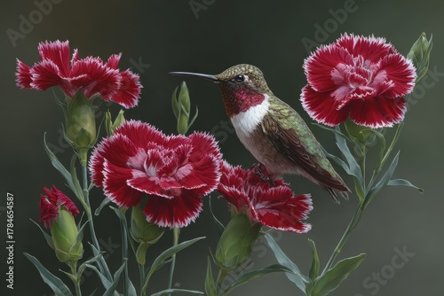 Obraz premium Elegant hummingbird perched among vibrant dianthus flowers in a tranquil...