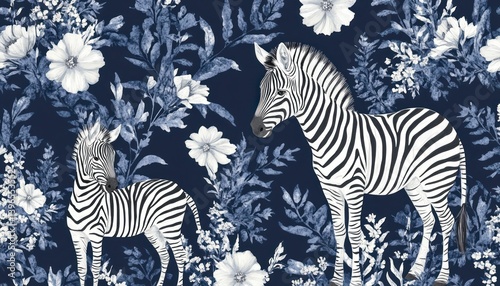 Fototapeta premium Elegant indigo zebras amidst a floral tapestry, evoking a sense of tranquil...