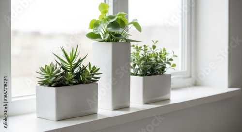 Fototapeta premium Elegant indoor succulent and potted plant display on a light-filled windowsill