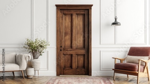 © Alfanachmad, Fototapeta premium Elegant Interior Design: Wooden Door, Armchair and Modern Decor