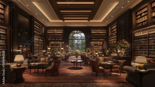 Obraz premium Elegant Interior of a Luxurious Library with Classic Decor, Warm Lighting, and Inviting Reading Spaces Surrounded by Floor-to-Ceiling Bookshelves and Cozy Furniture