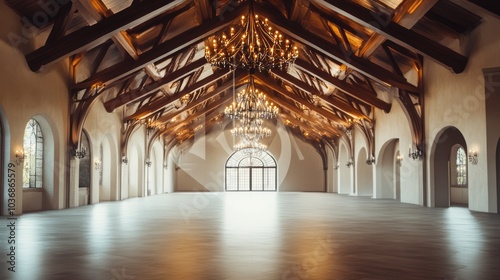 © Pannee, Obraz premium Elegant Interior of a Spacious Hall with Chandeliers