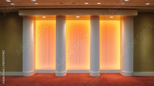 Fototapeta premium Elegant Interior with Soft Lighting and Classic Columns in Modern Space for Events and Gatherings, Featuring Warm Orange Hue and Subtle Textures