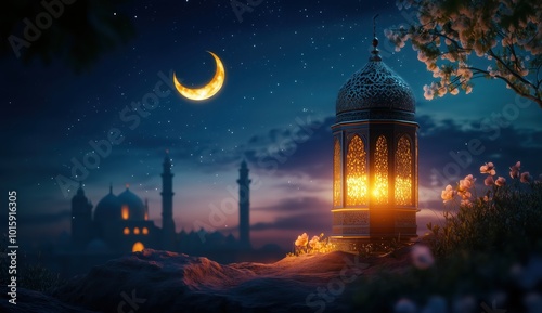 © CreativeSeven , Naklejka premium Elegant Islamic Background with Lantern and Crescent Moon Under a Starry Night Sky