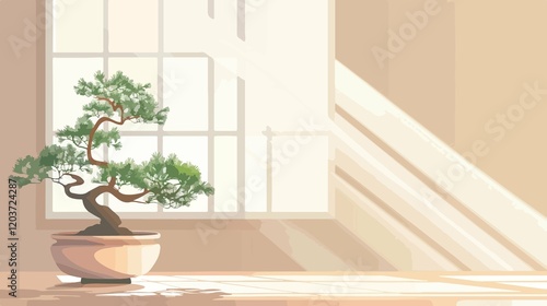 © Richard, Fototapeta premium Elegant Japanese Bonsai Plant on Table by Window, Space for Text