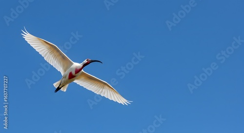 © Ethan, Obraz premium Elegant Japanese Crested Ibis in flight, soaring with widespread wings against a clear, brilliant blue sky.