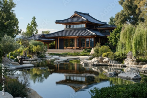Fototapeta premium Elegant Japanese house with landscaped garden
