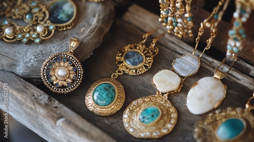 © Benjarin, Obraz premium Elegant jewelry collection featuring intricate designs and beautiful gemstones displayed on rustic wood.