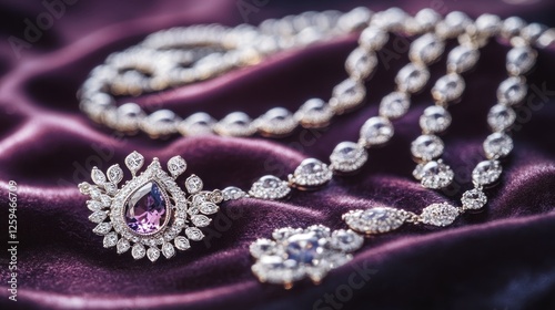Fototapeta premium Elegant jewelry necklace displayed on rich purple fabric
