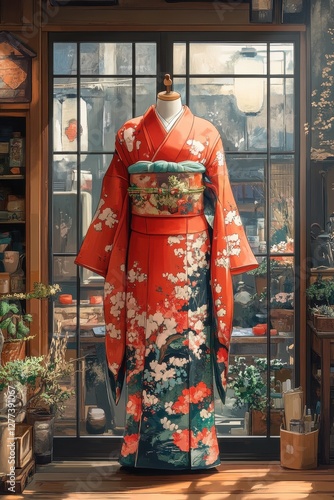 © aicandy, Naklejka premium Elegant Kimono Displayed on Mannequin Amidst Artful Floral Background in a Traditional Japanese Setting, Illuminated by Soft Window Light