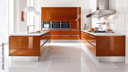 © Sagiam, Fototapeta premium Elegant kitchen design with wooden cabinetry, modern fixtures, open-plan layout