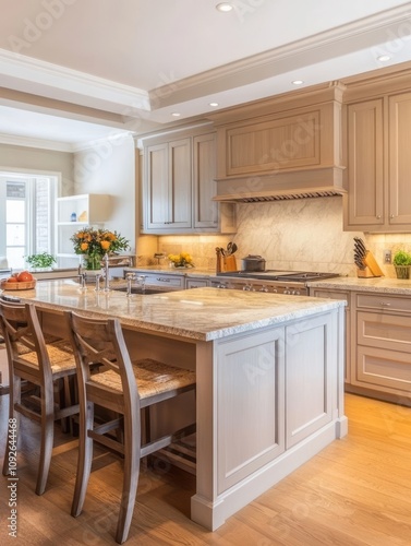 © Agus, Fototapeta premium Elegant Kitchen Island With Granite Countertop And Wooden Stools