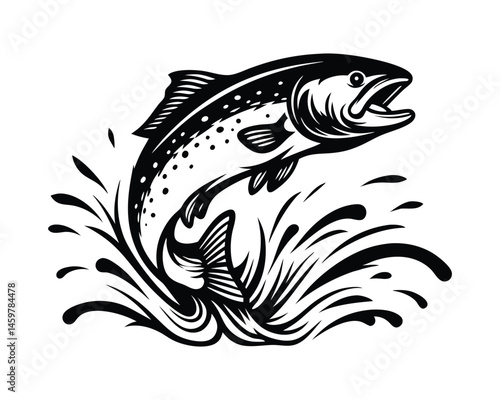 Fototapeta premium Elegant leaping dolphin black & white wave illustration on a white background