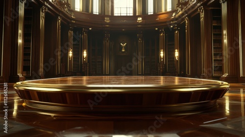 Obraz premium Elegant library interior with a polished wooden stage and shelves.