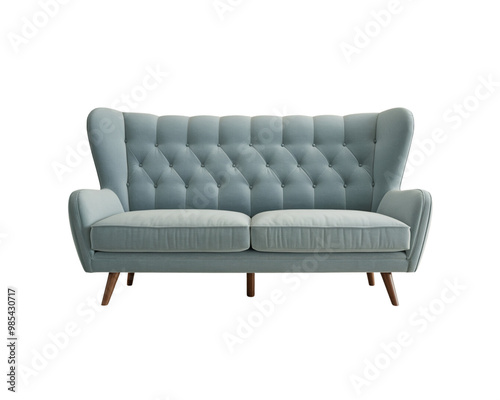 Fototapeta premium Elegant light blue velvet sofa with tufted upholstery and wooden legs