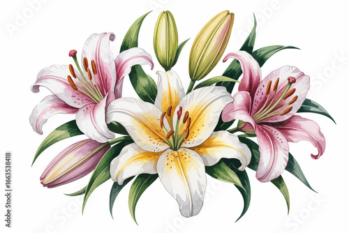 Fototapeta premium Elegant Lilies Bouquet Watercolor Painting of Pink and White Lilies